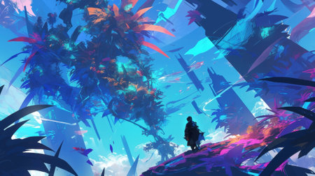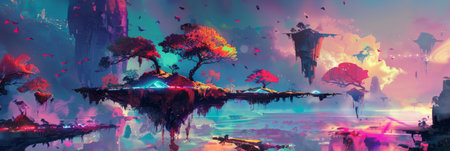 A bizarre, ethereal landscape where neon-colored trees grow on floating islands, offering a strikingly surreal and mystical vision that blends nature with abstract art