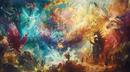 Surreal dreamscape with mythical creatures and heroes from Hispanic folklore background