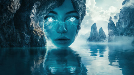 A captivating portrait reveals a woman's face with glowing blue eyes rising from serene waters. Breathtaking cliffs tower nearby under a mystical sky, creating an otherworldly atmosphere.