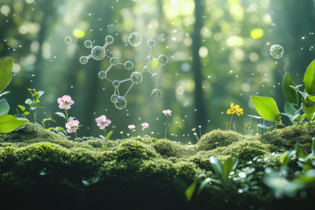 A stock photo of an illustration showing chemical structures floating above moss-covered soil, with small flowers and plants growing around them in the foreground. The background is greenery with sunlight filtering through it. --ar 3:2 --v 6.1 Job ID: 42fd235d-c222-4325-b6c9-064ac4fa9029