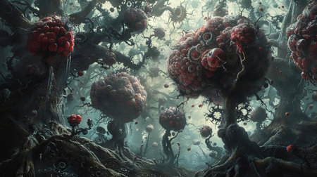 A dark fantasy art piece of a haunted forest, where trees have gears instead of leaves and brains hanging like fruits