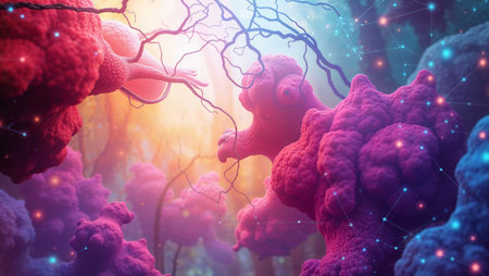 Microscopic view of cells dividing and multiplying, forming complex colorful patterns in an organic environment, showing the beauty and complexity of biological processes