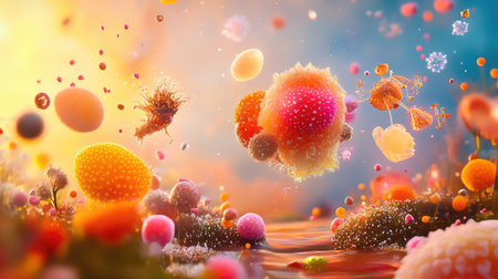 A vibrant and imaginative depiction of microorganisms and cells floating in a fantastical underwater landscape, showcasing colorful textures and ethereal forms.