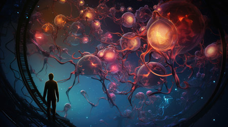 Cosmos and microbiome fusion featuring a sparkling sphere, ideal for background, AI generated