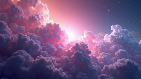 Majestic clouds softly glowing with starlight, pastel hues transitioning from dusk to dawn beautifully blend with ethereal cosmic light, creating heavenly atmosphere.