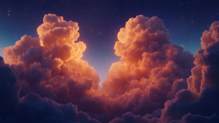 Fluffy orange and yellow cumulus clouds create a breathtaking sky view with a starry night background