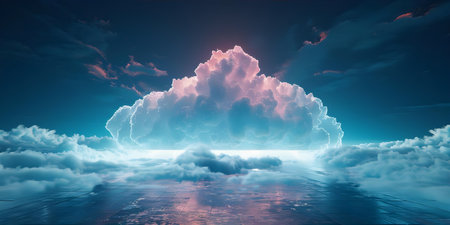 A large cloud floating in the sky above a calm body of water. The cloud is surrounded by a blue sky and the water is still and reflective. Concept of tranquility and peace