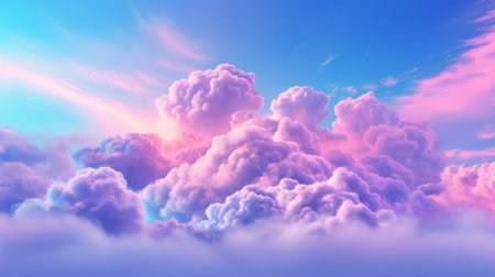 Photo of light blue soft pink fluffy cloud, 3D cloud with pastel cloud. Close up of fluffy cotton candy and sky. Abstract artistic background with water color and wallpaper. Sunlight shine. AIG42.
