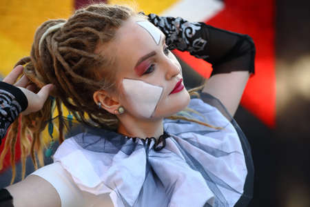 Portrait of a young woman in clothes and make-up of clown on a colored background outdoors