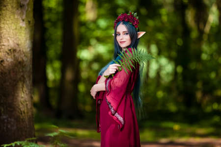 Costume Play Ideas. Forest Sprite in Flowery Garland Posing with Elf Enlarged Ears in Summer Forest With Fern Leaves. Horizontal Image Composition