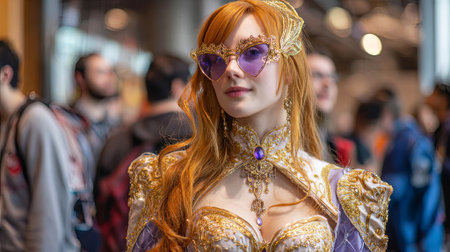 Female cosplayer showcases intricate golden costume and stylish sunglasses, posing amidst a lively convention atmosphere filled with enthusiastic fans and vibrant colors, AI generated