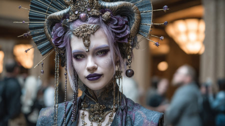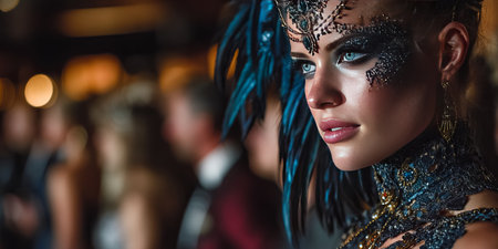 Elegant woman in ornate masquerade costume with feathers and intricate makeup at a glamorous evening event.