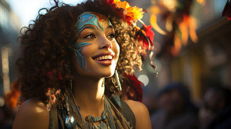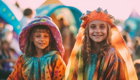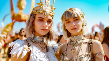 Two women in costumes standing next to each other in front of carnival. Generative AI