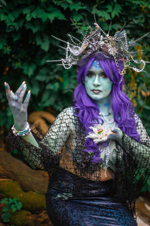 fabulous dark mermaid with blue skin in the forest close up
