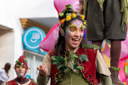 LOULE, PORTUGAL - 17th FEB 2024: Colorful Carnival (Carnaval) Parade festival participants on Loule city, Portugal.