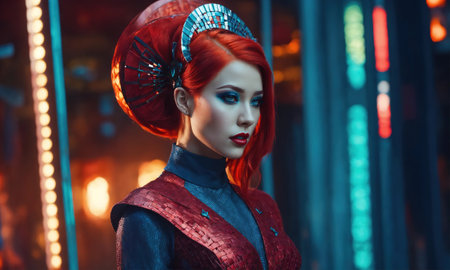 Futuristic woman with red hair in futuristic costume. ai generative.