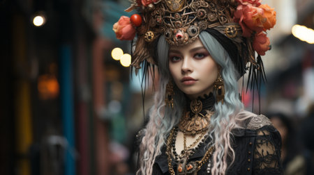 A woman stands proudly on the street, adorned in a vibrant flower-covered hat and dazzling necklace, embodying a captivatingly stylish look
