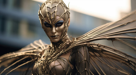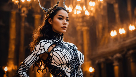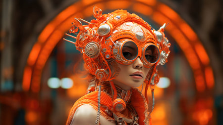 An AI generated illustration of A beautiful woman wearing an ornate gold and orange costume