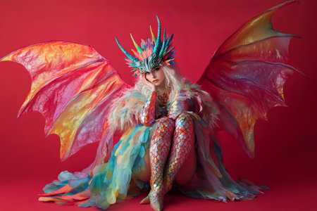Fantasy portrait of a beautiful woman wearing a colorful dragon fairy costume with large wings, posing on a red background