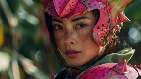 Portrait of a beautiful girl with bright make-up and red headdress. ai generative.