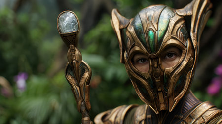 Mysterious warrior with glowing staff in enchanted forest