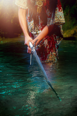 A mysterious blond woman holds a dagger of beautiful Gothic design in her hands. Fantasy lady soldier fashion warrior in a dark forest. Shooting without a face, only lips and hands. Cut off the head