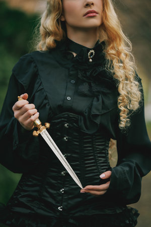 Close-up of woman with solemn face gripping ornate dagger, dressed in corset and black lace dress. Concept of vintage fashion, fantasy, gothic courage, silent power, secret ritual. Ad