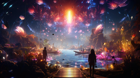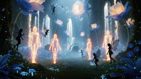 An imaginative artwork depicts luminous figures amidst fantastical floral elements. The scene features a combination of glowing entities, stylized plants, and light beams. The composition utilizes a palette of blues and golds, offering a dreamlike atmosphere. Suitable for use in conceptual designs, illustrations, and various creative projects.