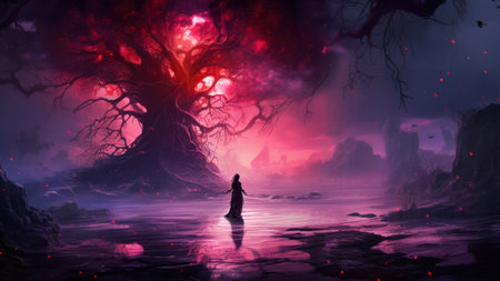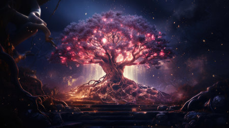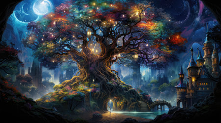 Beautiful fantasy landscape with a big tree on the hillside.