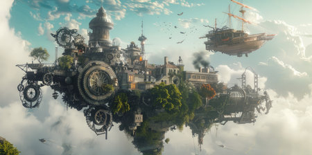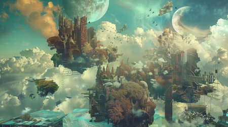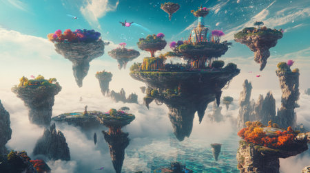 Futuristic floating islands with greenery and bright sky