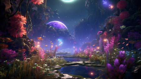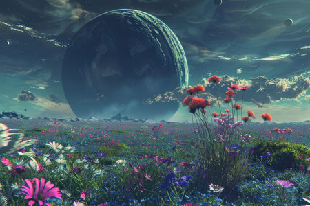 A depiction of a field of colorful flowers on an alien planet, with a large moon dominating the sky.