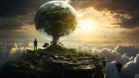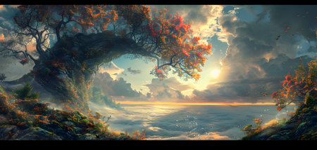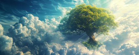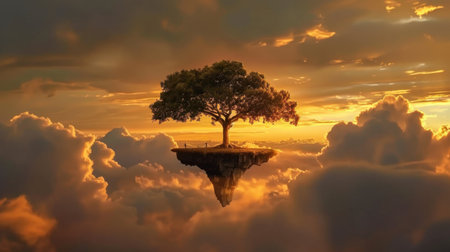 Majestic tree stands alone on floating island amidst dreamlike atmosphere, surrounded by vibrant clouds and stunning sunset. This surreal scene evokes sense of wonder and tranquility