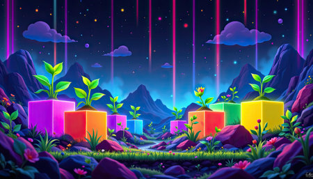 A vibrant and surreal fantasy landscape features luminous cubes and flourishing plants against a starry night sky, evoking feelings of magic and creativity.
