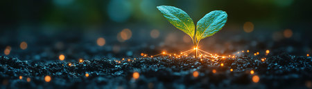 Small plant sprouting from soil, connected to a digital network