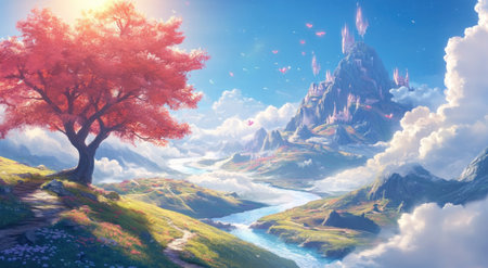 Concept art of an epic fantasy landscape: a valley with a beautiful tree on the left side and some small mountains in front of it. A river runs through it, and in the background, you can see several castles floating above the clouds. The sun shines brightly over everything, creating a warm, cinematic atmosphere. --ar 78:43 --v 6.1 Job ID: 3e88dc99-1717-4ff9-b421-ccab7082b1f4