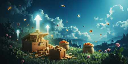 A treasure chest overflowing with gold coins on a grassy hill under a cloudy blue sky with arrows