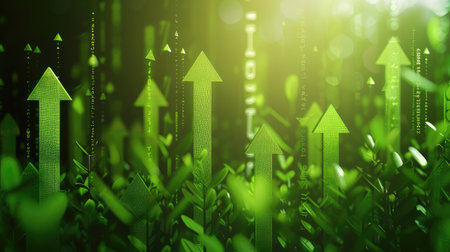 Green arrows symbolizing sustainable and ecological development, emphasizing environmental growth and eco-friendly progress on a dynamic background.