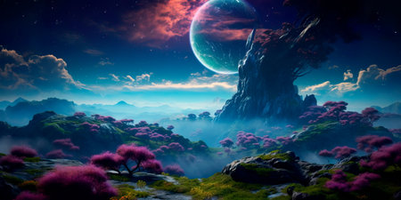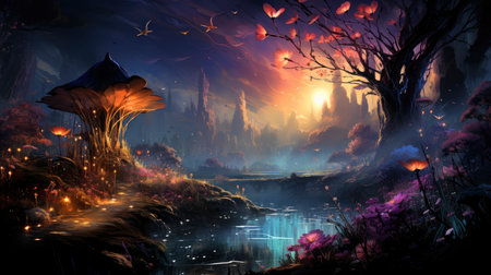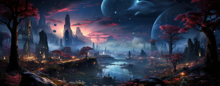 Mystical landscape with glowing trees, moonlit sky, and serene waters in a fantasy world setting. Perfect for dreamy designs