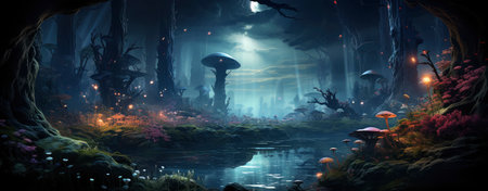 Enchanted woods illuminated by luminescent fungi, bathed in moonlight, exuding a magical ambiance ideal for fantastical endeavors