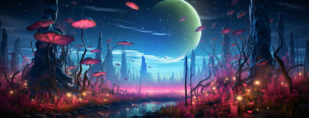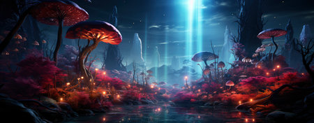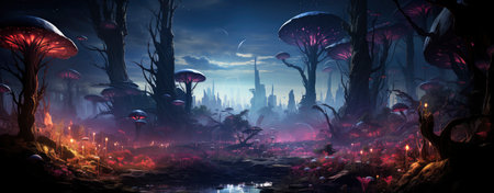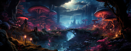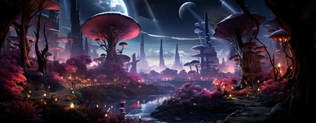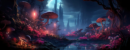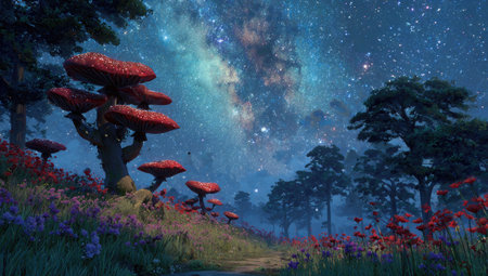 An imaginative landscape presents large, red-capped mushrooms under a vibrant night sky. Lush trees and colorful flowers dot the foreground, creating a mystical environment. The image uses a painterly style and features rich color gradients and soft lighting, suitable for illustrative and artistic projects.