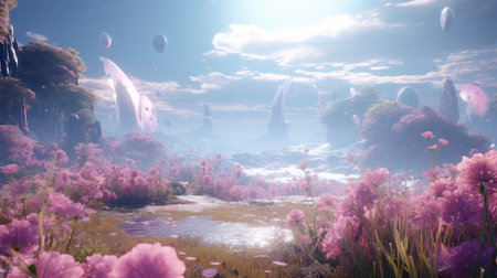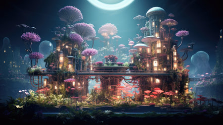 Fantasy landscape with fantasy buildings and flowers. 3D rendering.