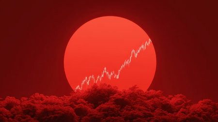 A striking image of a large red sun setting beyond fluffy clouds, with a rising financial graph overlay symbolizing growth and potential opportunities.
