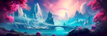Banner: Fantasy landscape with a fantastic alien planet. 3D illustrations.
