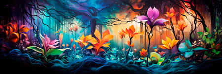 Beautiful glowing flowers in fantasy neon forest, path in dark magical woods at night, luminous plants and lights on dreamlike planet. Concept of fairy tale world, nature, wonderland, art. Generative AI