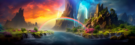 fantasy landscape with a gradient background of magical colors, sense of enchantment and wonder. Generative AI