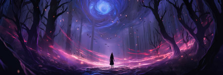 Fantasy landscape with a witch in a dark forest