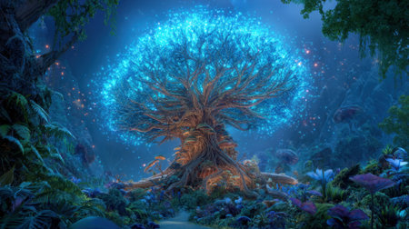 A giant tree radiates bright blue light in a serene forest under a starlit sky. Lush plants surround the tree, creating a magical, dreamlike atmosphere at night.