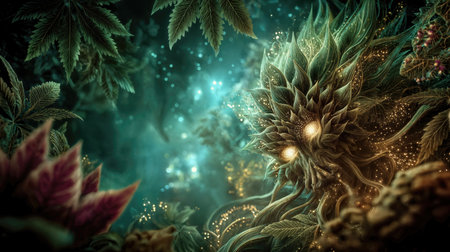 Enigmatic allure of shamanic nature as luminous plant spirits blend with enchanted elements to create a transformative, healing ritual of forest mysticism.