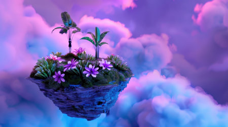 Experience a colorful floating island filled with lush greenery and vibrant flowers surrounded by dreamy clouds, creating a serene and magical atmosphere.