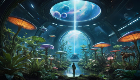 A lone figure stands amidst a lush extraterrestrial garden inside a space observatory, gazing at a cosmic panorama through the glass dome above.. AI Generation